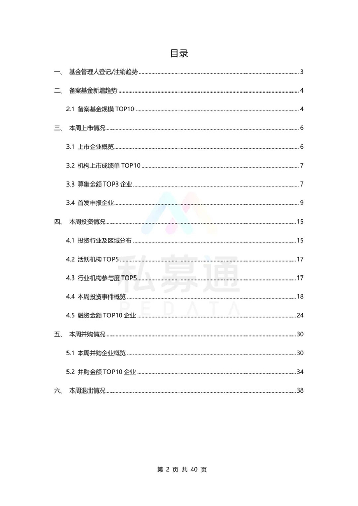 本周共发生15笔退出案例,较上周减少42起。退出方式数量前二:IPO退出13笔,涉及金额33.93亿元;并购退出2笔,涉及金额5.05亿元。
