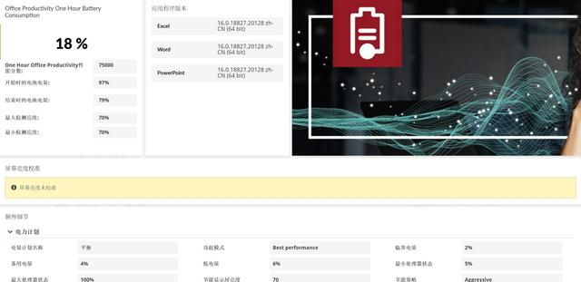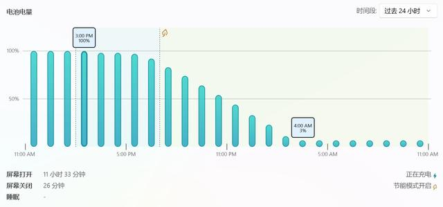 首先我们使用PCMark 10办公模式,在50%屏幕亮度、50%音量、Wi-Fi/蓝牙全开,60Hz刷新率,节能模式下进行了测试,不过PCMark 10软件自身问题导致结果无法正常显示,但是通过系统自带的电池电量监测可以看到,从首日下午3点时100%电量到次日凌晨4点3%电量,实际续航时间超过了12小时,满足全天候不插电办公没有太大问题。