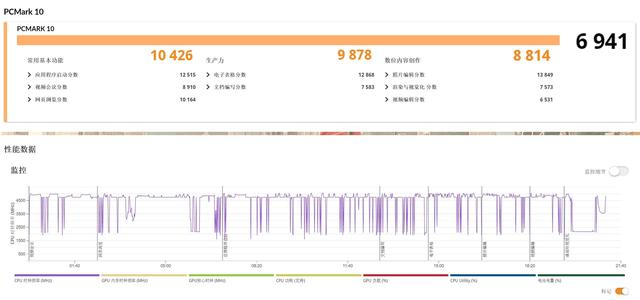 生产力理论性能方面,参考PCMark 10办公模式测试:常用基本功能,包含Web浏览、视频会议、应用程序启动等得分为10444分,说明其完成这些基础办公任务没有任何问题;生产力项目测试中得分高达10346分,表明其拥有卓越的电子表格、文档工作性能;数位内容创作评分高达8931分,说明其能够非常高效地完成图片、视频编辑、图形渲染等工作;综合得分7085,应对日常办公、娱乐应用没有任何问题。