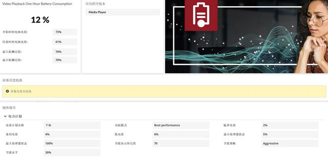 另外笔者也使用UL Procyon对ThinkPad T14进行了1小时Office办公和Media Player视频连续播放测试,掉电量分别为18%和12%。注意这项测试我们将屏幕亮度设定在了节能模式默认的70%亮度,而且刷新率设定在了120Hz,如果想要更长续航时间,可以将亮度和刷新率调低,整体表现会更加出色。
