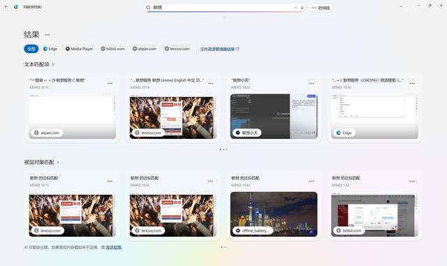 该功能通过高频次系统截图的形式打通了不同应用的历史记录,同时借助AMD锐龙AI PRO 300系列处理器的NPU完成后台对截图内包含的应用信息、文字信息和图像信息的分析,从而构建每台设备专属的使用记录时间线,用户可以随时回溯或通过自然语言查找符合的记录。比如笔者直接模糊搜索一个关键词“联想”,可以看到过去一段时间里所有跟“联想”这一关键词有关的内容都会呈现在「回顾」界面,查找起来非常方便。