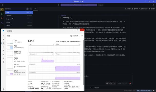 总体来说,搭载AMD锐龙AI 7 PRO 350处理器的ThinkPad T14更加适合在本地运行1.5B或4B参数量的大语言模型,生成速度可以达到12.94 tok/s以及6.52 tok/s,另外7B、8B大模型也可以正常使用,但是速度相对会慢一些。