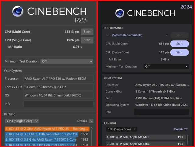参考CINEBENCH R23和2024测试,这颗处理器在R23测试标准下单核得分1926,多核得分13313;2024标准下单核得分112,多核得分684,整体表现还是相当给力的。满足日常办公应用、影音娱乐需求不成问题。