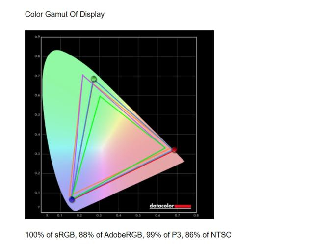 此外,这款机器配备了一块14英寸2880×1800分辨率的OLED显示屏,16:10黄金比例为办公带来更开阔的视觉观感体验。同时这块屏幕达到了100% sRGB和99% DCI P3色域覆盖,最高亮度为521.5nits,平均色准ΔE值为1.47,满足日常办公、影音娱乐的视觉观感体验不成问题。