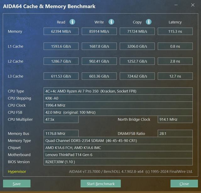 通过AIDA 64内存性能测试可以看到,ThinkPad T14标配的32GB LPDDR5x内存读取速度为62394MB/s,写入速度为85914MB/s,拷贝速度为71724MB/s,延迟为115.3ns,整体速度还可以,对于办公而言足够用了。