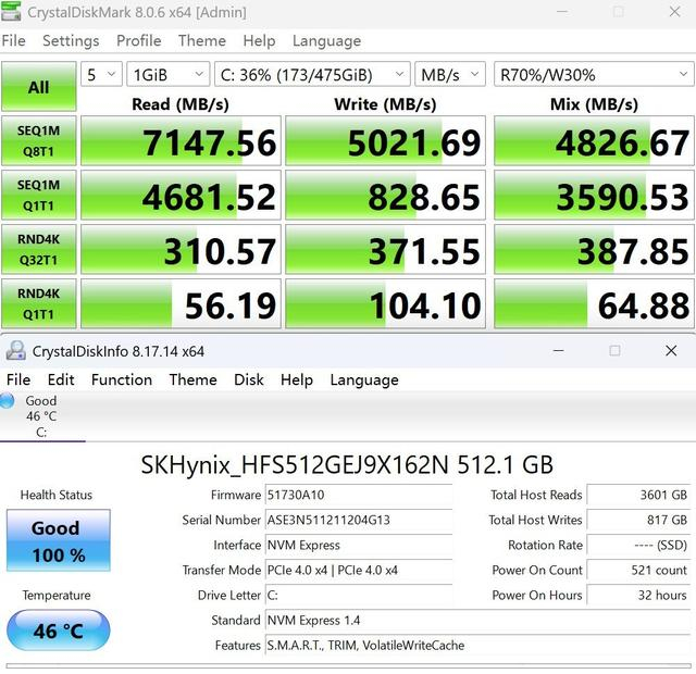 这款机器配备了一块SK海力士的512GB PCIe4.0固态硬盘,性能相当不错,实测顺序读取速度达到了7147.56MB/s,顺序写入速度5021.69MB/s;4K随机读取速度为56.19MB/s,4K随机写入速度为104.1MB/s,达到了PCIe4.0固态硬盘的中高端性能水准,确保了系统、软件流畅加载和运行。