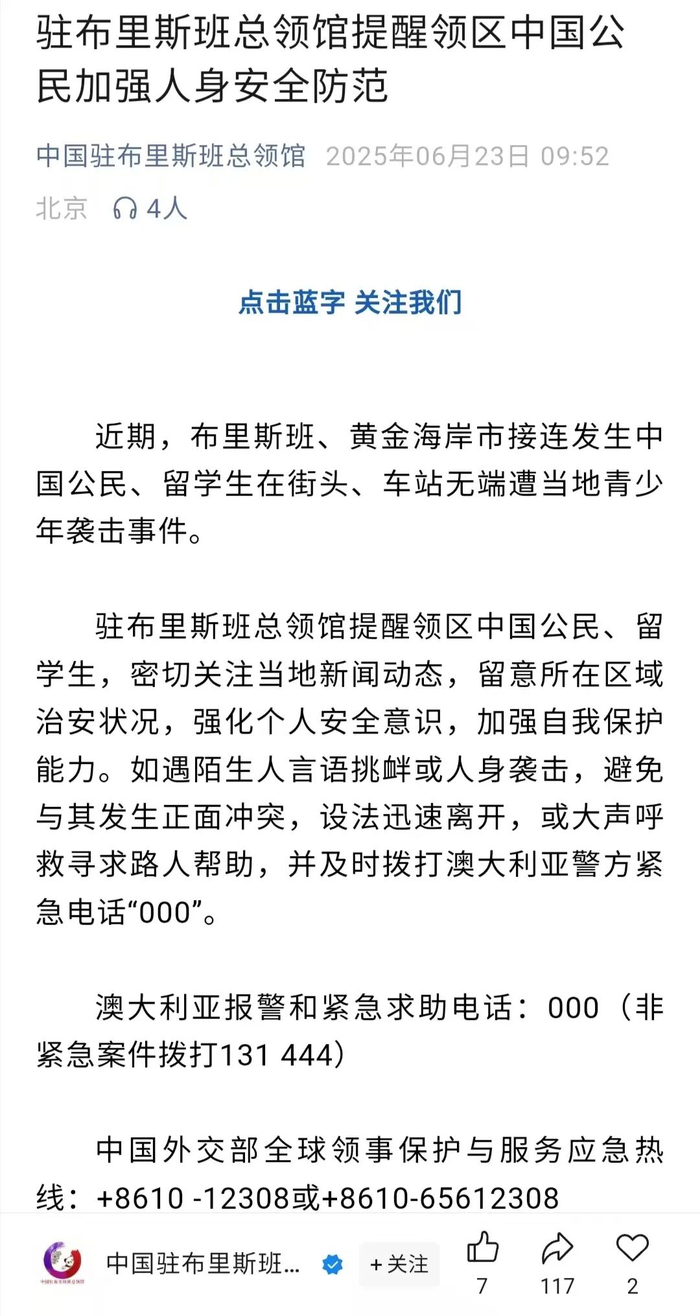 4、我驻布里斯班总领馆提醒领区中国公民加强人身安全防范近期,澳大利亚布里斯班、黄金海岸市接连发生中国公民、留学生在街头、车站无端遭当地青少年袭击事件。当地时间6月23日,我驻澳大利亚布里斯班总领馆发布通知,提醒领区中国公民、留学生,密切关注当地新闻动态,留意所在区域治安状况,强化个人安全意识,加强自我保护能力。(中国驻布里斯班总领馆微信公众号)