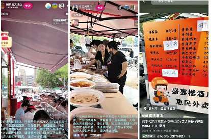 “我们是从6月9日开始外摆的。”酒店刘经理介绍说,“没想到这10元套餐还挺受欢迎。”摆摊的时候,刘经理还会打开抖音直播,通过镜头向更多人展示酒店的美食。