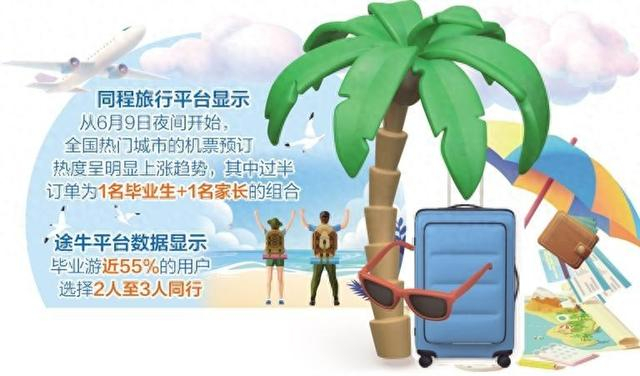 毕业生们普遍选择与家人或好友结伴出游。同程旅行平台显示,从6月9日夜间开始,全国热门城市的机票预订热度呈明显上涨趋势,其中超过一半的订单为1名毕业生+1名家长的“1+1”组合。途牛平台数据也显示,毕业游近55%的用户选择2人至3人同行的出游方式。