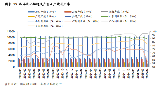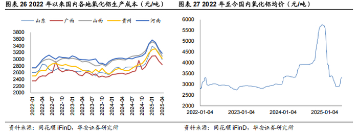 晋豫铝土矿复产缓慢,广西氧化铝成本占优。根据SMM调研,山西煤矿事故及河南环保问题影响铝土矿复产进度缓慢,当地的氧化铝产能对于进口矿的依赖程度提升,存在成本高企及产能利用率较低的问题。而国内其他地区,如广西具备自有矿+港口优势,山东具备港口优势,成本相对较低。从价格上来看,2024年底以来由于GAC出口暂停导致的矿石供应紧张的问题逐步缓解,叠加新产能释放,氧化铝价格冲高回落,价格从2024年12月中旬的最高点5757元/吨下降至2025年4月最低点2886元/吨,成本倒挂的情况下有大批氧化铝厂检修减产或者压产运行。由于本身停复产成本较低,我们认为氧化铝价格下探空间有限,后续有望保持相对稳定,但需要警惕矿端供给变化造成的风险。