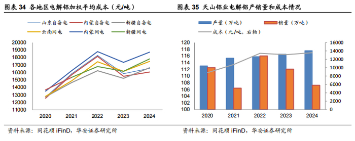 新疆煤电优势领跑全国,公司成本领跑新疆。内蒙和新疆具备煤炭供给优势, 电力成本优于内陆企业,天山铝业主要产能位于新疆石河子,毗邻电解铝产线配备 电厂,截至2024年末共有6台350MW自备发电机组,年发电量能满足自身电解铝 生产 80%-90%的需求。在 2024 年原料价格上涨的情况下,公司电解铝销售成本 13582 元/吨,较2023年同比+3.6%。