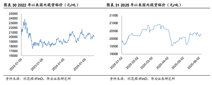 供给约束为价格提供支撑。2021年国内供给侧改革、2022年初俄乌冲突影响海外 供给铝价冲高,2022年3-7月美联储加息、公共卫生事件影响需求、高价刺激产能释放 等一系列因素影响下国内现货铝价跌至最低点17436.7元/吨,2022年7月中旬至今铝 价震荡上行,未跌破支撑位。2025年来看,Q1国内政策提振需求铝价维持高位,4月以来美国关税政策影响铝价波动,但整体在中美关系缓和、国内政策提振下,铝价仍然保持稳定。后续仍需关注贸易政策及宏观环境,整体看在供给约束的背景下铝价有望保 持高位震荡。