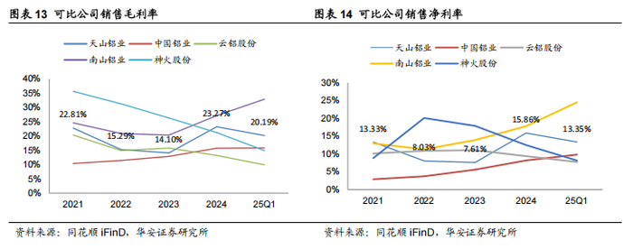 产业链一体化优势显著,降本推动利润率提升。公司完善从铝土矿到铝加工一体化生产链,进一步优化产能和降低成本推动利润率提升。公司2024年毛利率和净利率分别为23.27%和 15.86%,较 23 年同比分别+9.17pcts 和+8.25pcts。横向对比,公司卡位新疆具备煤电成本优势,叠加产业链一体化平滑原材料价格波动风险,利润率仅低于汽车板行业领先具备产品结构优势的南山铝业。