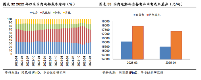电解铝成本中电力和氧化铝占比最高。以2025年4月为例,电力、氧化铝和阳极 占吨铝生产成本的比重分别为33.64%、36.29%和15.51%,国内自备电和网电的电解 铝产能加权平均完全成本分别为15474元/吨和17331元/吨。除原材料外,电力成本在 电解铝生产中占比最高,电力优势亦成为行业核心竞争力之一。