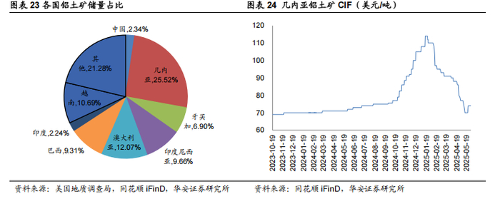 海外铝土矿供给扰动频繁。根据美国地质调查局的数据,中国铝土矿储量仅占 全球储量的 2.34%,几内亚、澳大利亚、印尼等国储量更高。但由于铝土矿产业附 加值有限,印度尼西亚2023 年6 月起禁止铝土矿出口,必须在当地建下游配套设 施。同样几内亚亦对铝土矿开采有所限制,如2024年10月阿联酋铝业在几内亚的 GAC铝土矿出口被海关暂停,2025年5月撤销包括铝土矿、黄金在内的129家矿 业公司的勘探许可证等,5月末进口铝土矿价格止跌反弹。