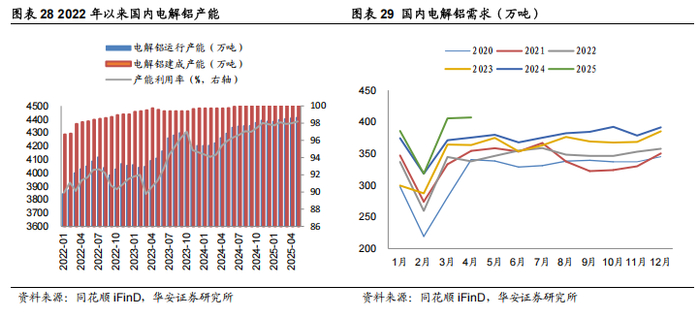 电解铝供给端限制,需求仍维持高位。供给端,国内严控电解铝新增产能,要求严 格落实产能置换,并且到2025年底行业能效标杆水平以上产能占比达到30%,能效基 准水平以下产能完成技术改造或淘汰退出。截至2025年5月国内电解铝建成产能和运行产能分别为4520.2和4413.9万吨,产能利用率达98.2%,供给端弹性有限。需求端,2024年国内电解铝需求4490万吨,同比+5.1%,2025年1-4月仍然维持增长,较上年同期需求同比+5.1%,交运、电力等需求增长,电解铝需求有望维持高位。