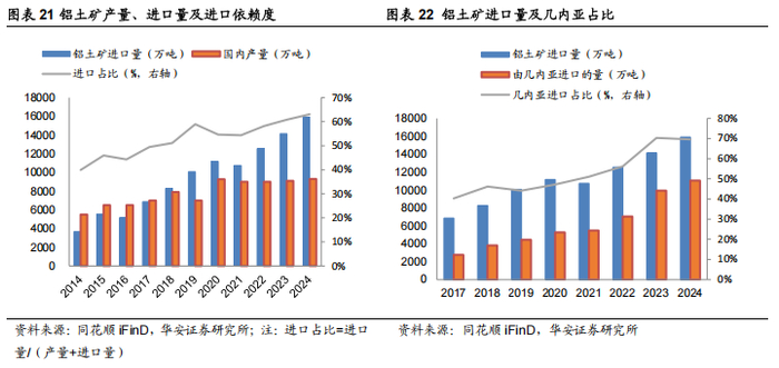国产矿开采难度增加,进口依赖度提升。2024 年中国铝土矿产量 9300 万吨, 国内供应趋于缩紧的状态,铝土矿品位下滑、开采难度扩大以及由复耕、环保、检修等引起的停产限产,国内铝土矿产量维持增长有一定困难。铝土矿进口量及进口依 赖度逐年提升,2024年进口量1.59亿吨,其中由几内亚进口的铝土矿1.1亿吨,海 外尤其是几内亚铝土矿的供给成为铝产业链的重要制约因素。