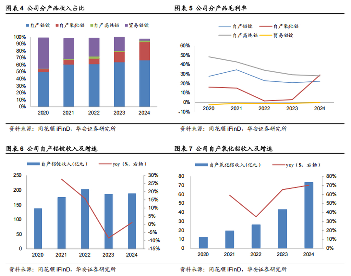 自产铝锭贡献主要利润,上下游延伸拓宽利润空间。公司布局一体化铝产业链,2024年公司自产铝锭/自产氧化铝业务贡献收入分别为67%/26%,主要收入由自产 铝锭贡献,氧化铝随着新增产能投产和价格提升占比也有所提升。从利润率来看, 2024年自产铝锭毛利率22.36%(同比+1.58pcts),自产氧化铝毛利率29%(同比 +26.14pcts),主要受到价格上涨影响。