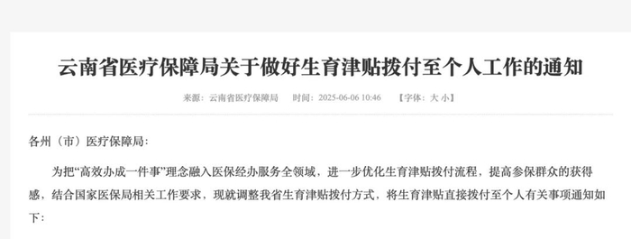据悉,2025年7月底前,云南省各级医保经办机构实现生育津贴拨付至个人,即符合生育津贴申领条件的参保人员,其生育津贴经申请后由医保经办机构直接拨付到个人。