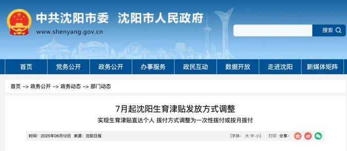 6月11日,沈阳市人民政府召开新闻发布会,明确从7月1日起,沈阳医保调整生育津贴发放方式,实现生育津贴直达个人,拨付方式也调整为一次性拨付或按月拨付。