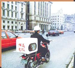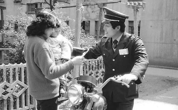 当年电报投递员给用户送电报。