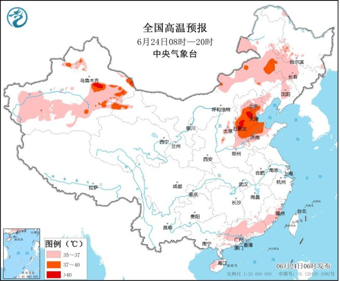 中央气象台今晨继续发布高温黄色预警:预计今天白天,北京、天津、河北中南部、山东中北部、河南北部、内蒙古东部、辽宁中西部、吉林西部、黑龙江西南部、新疆东疆和南疆盆地以及广东中南部、福建东南部等地有35℃以上的高温天气,其中,北京中南部、天津、河北中南部、山东北部、内蒙古东部及新疆东疆和南疆盆地等地部分地区最高气温37~39℃,局地可达40℃以上。