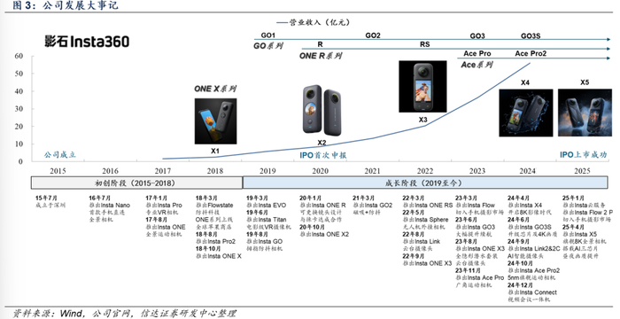 产品创新驱动,引领行业技术升级。纵观公司发展历程,具有显著的产品创新驱动特征,以“供给创造需求”。公司自2015年成立后积极探索影像技术落地,推出了业内首款手机直连全景相机Insta360 Nano、专业VR相机Insta360 Pro、全景运动相机Insta360 ONE,奠定基本产品形态。2018年推出标杆性Insta360 ONE X系列后则进入快速发展轨道,以1.0-1.5年的迭代频率打造X系列大单品,截至2024年X系列收入占比达到52.3%。公司亦积极布局新品类、新场景,2019、2020、2023年分别推出GO系列、ONE R系列、Ace系列,并在近年以Insta360 Sphere、Insta360 Flow、Insta Link/Connect切入无人机、手机和视频会议场景。