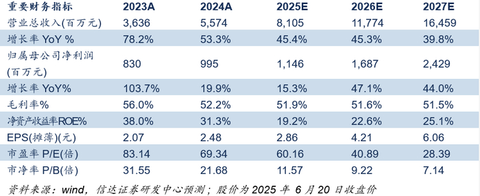 我们预计公司2025-2027年收入分别为81.1/117.7/164.6亿元,同比增速分别为45.4%/45.3%/39.8%;归母净利润分别为11.5/16.9/24.3亿元,同比增速分别为15.3%/47.1%/44.0%。