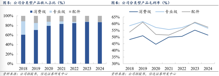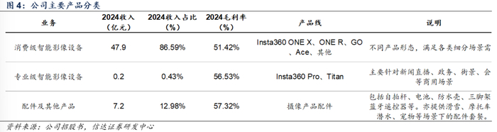 2024年公司消费级、专业级、配件产品收入占比分别为86.6%、0.4%、13.0%,在滑雪、骑行、摩托车等户外运动群体中已具有良好口碑和市场渗透,近年来亦开始对vlog等视频创作群体进行渗透。毛利率方面,公司产品由于技术创新特色突出,维持较高水平。其中消费级产品2024年约51.4%,专业级产品、配件则略高,分别约为56.5%、57.3%。