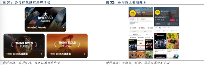 此外公司还积极举办品牌宣传活动增强粘性和“Insta360影石”品牌美誉度,例如Insta360 Awards、Think bold.挑战基金、Think bod.英雄基金等,鼓励用户使用公司产品拍摄创意视频、记录公益行为,并提供拍摄设备、技术支持等帮助。公司也已布局小红书、抖音等社交媒体,作为对传统新闻媒体、展会等宣传渠道的补充。