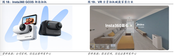 ■ 运动相机:整体市场仍较为分散,2023年全球市场排名前三为美国GoPro、影石创新、大疆,其他厂商还有AKASO、SJCAM等。但从趋势上看,新晋品牌厂商凭借创新实力及研发技术迅速抢占市场,随着全景技术在运动相机的应用加速渗透,公司有望凭借先进的全景技术、模块化技术、防抖技术及 AI 技术占领更多市场份额。