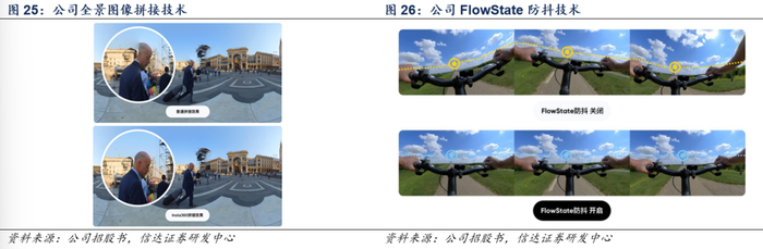 多维研发架构清晰,产品技术行业领先。公司设立了以研究院、产品中心和技术中心为主的多维度研发体系:①研究院主要负责计算机视觉、图像技术储备和算法加速等核心技术研究;②产品中心主要负责完成产品的需求设计、交互设计等;③技术中心主要负责技术、原理及电路板设计等。此外公司还设立了品牌中心、行业应用中心、供应链中心,在交互设计、行业及竞品分析以及研发制造工艺等方面提供支持,帮助技术落地和商业化。截至2024年,公司拥有境内外授权专利900项,通过自主研发形成了全景图像采集拼接技术、防抖技术、AI影像处理技术、计算摄影技术、软件开发技术框架、模块化防水相机设计技术、音频处理技术和框架等智能影像设备关键领域的核心技术。