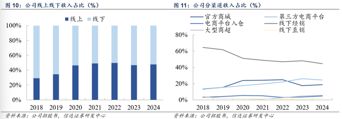 全渠道均衡布局,跨境电商增长快。公司在渠道布局上较为均衡,截至2024年线上、线下收入占比分别为48.0%、52.0%,并不断拓展新渠道、新客户。分类型看,目前共分为六大类销售渠道:①官方商城,即官网自营电商;②第三方电商平台,包括亚马逊、淘宝、京东等主流平台;③电商平台入仓,主要为京东自营;④线下经销,线下经销商网络;⑤大型商超,例如Bestbuy、Sam’s Club;⑥线下直销,包括对企业客户的销售以及2023年开始铺设的自营门店。