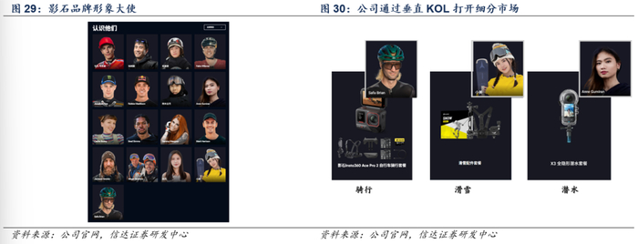 深度绑定垂直KOL,创新营销打法。从具体营销打法上看,公司的特色在于与主要下游垂直领域KOL深度合作,打入科技、摄影、运动等细分群体市场。例如公司“影石品牌大使”汇集了全球众多顶尖运动员、冒险家和创作者,在圈层内具有较高知名度和认可度。通过与KOL进行合作,配合产品升级尤其是丰富的配件创新,公司有效打开了细分市场、激发消费者购买。例如公司与自行车手Safa Brian合作针对骑行群体推出自行车套餐,与资深滑雪与户外博主小雪合作推出滑雪配件套餐,与自由潜水员&冒险家Anne Gumiran合作推出全隐形潜水套餐。