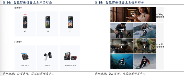 目前智能影像设备主要包括运动相机、全景相机两大主要产品形态:①运动相机起源于运动户外场景,通常以第一人称视角进行拍摄,通过配件固定在身体某部位、头盔、滑板、自行车把手上,并具有更强的抗震、防水、防尘、耐热、耐摔等性能。②全景相机则基于全景技术拍摄三维全景图像,具有全方位、真实性、三维性特点。从下游使用场景上看,主要可分为户外运动(包括骑行、滑雪、潜水等)群体和Vlog视频创作者群体两大类。