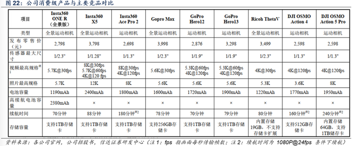 以公司ONE R/X、Ace系列为代表,选择GoPro推出的GoPro Max、GoPro Hero12、GoPro Hero13,日本理光推出的Ricoh Theta V以及大疆推出的DJI OSMO Action 4、DJI OSMO Action 5 Pro作为对标产品: