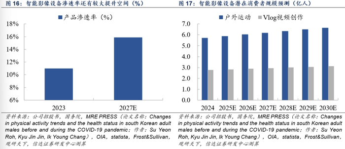 作为典型的以产品创新驱动需求增长的行业,智能影像设备需求增长目前主要由产品渗透率提升带动,未来市场规模随着产品进一步完善以及消费者教育普及尚有较大提升空间。我们预计2024年全球户外运动群体、Vlog视频创作者群体分别接近6亿、3亿人,对快速拍摄、三防属性和更具创意的多视角玩法&剪辑模板有较强需求,是值得重点探索的潜在消费群体。我们测算2023年全球智能影像设备渗透率接近10.9%,2027年可能达到15.9%。