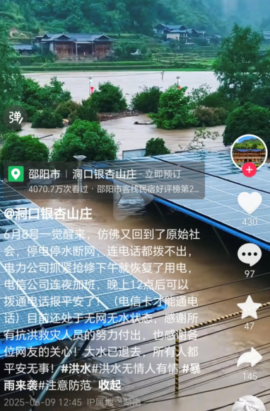 “一觉醒来,仿佛又回到了原始社会。电力公司抓紧抢修恢复用电,电信公司连夜加班,晚上12点终于可以拨通电话报平安了!感谢所有抗洪救灾人员的努力付出!大水已退去,所有人都平安无事!”6月9日暴雨过后,湖南洞口县罗溪瑶族乡当地居民发布了一条短视频,为央企及时恢复通电、通信点赞。