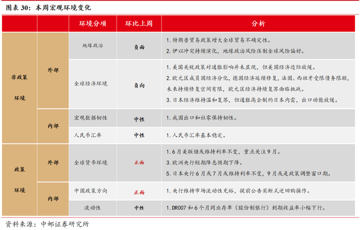 在非政策环境方面,美国关税政策的影响边际消退,中东地缘政治风险上升,压制全球风险偏好。一是美国关税政策对通胀影响并未明显显现,但美关税政策对经济影响逐步显现,供需两端均边际放缓。二是欧洲经济延续弱复苏迹象,但需关注欧元区内部经济分化,对欧洲央行货币政策产生制约。三是受美关税政策影响和日本国内高企通胀影响,日本经济温和修复面临挑战。四是我国经济长期向好基本面。
