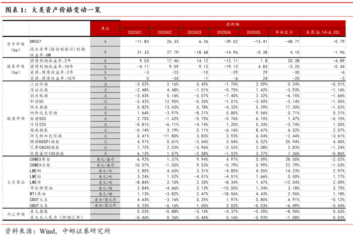 6月第3周(6.14-6.20),DR007和6个月同业存单(股份制银行)到期收益率小幅下行;国债市场方面,短端和长端利率小幅下行,短端下降更为明显,利率曲线趋陡;全球主要经济体股票市场有所回落,或是受地缘政治风险上升影响;商品市场走势分化,黄金、白银、大豆、玉米价格下降,铜、铝、锌、原油价格上涨;外汇市场方面,美元指数小幅升值,人民币汇率基本持平。