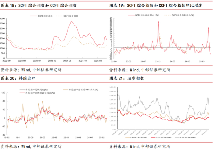 韩国出口增速边际回升。韩国6月前10天出口总额同比增长5.4%,较5月同期增速降幅上升29.2pct。考虑基数效应,6月前10天出口两年复合增速为0.59%,较5月同期上升6.29pct。