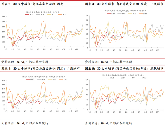 从同比增速来看,6月商品房销售同比增速转正,较5月同比增速较为明显回升。截至6月20日,30大中城市商品房日均成交面积较2024年同期增长7.48%,好于5月同比增速-6%。其中,一线城市商品房日均成交面积较2024年同期增长16.66%;二线城市商品房日均成交面积较2024年同期增长25.78%;三线城市商品房成交面积较2024年同期增长1.65%。