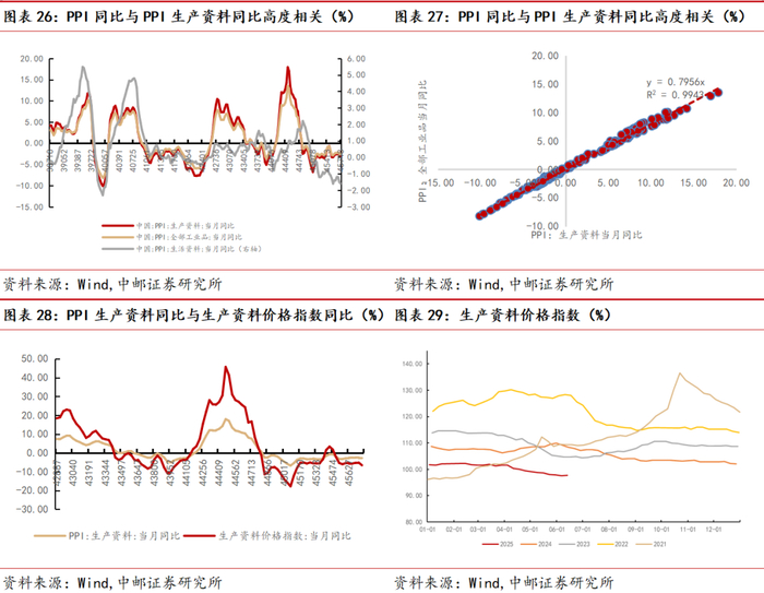 从历史数据来看,PPI当月同比增速与PPI:生产资料同比增速保持高度正相关,相关系数为0.7956,两者拟合曲线的拟合优度为0.9943,这意味着生产资料价格同比增速变动可以前瞻指示PPI当月同比增速的趋势。而PPI:生产资料同比增速与生产资料价格指数同比增速保持正相关,相关系数为0.4214,两者拟合曲线的拟合优度为0.9639,这意味着生产资料价格指数同比增速变动可以前瞻指示PPI:生产资料同比增速的趋势。因此,可以通过观察生产资料价格指数来观察PPI同比增速变化。