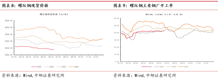 截至6月20日,6月主要钢厂螺纹钢开工率周均为42.19%,较5月同期开工率上升0.12个百分点,且6月开工率呈现逐周回升特点,说明螺纹钢供应增加。螺纹钢价格并未上升,环比走弱。截至6月13日,6月螺纹钢现货价格平均价格为3385元/吨,较5月同期下降2.28%。从库存来看,截至6月13日,6月主要钢材品种库存合计均值为929万吨,较5月同期下降8.32%,降幅较为明显,说明需求确实有所增长,而螺纹钢现货价格低位徘徊,或主要是供给增加导致。因此,整体来看,工业需求有所回暖,但因钢铁行业供给充足,价格并未改善。