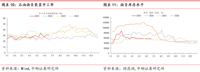 石油沥青装置开工率环比回升,库存环比走低,说明需求环比有所回暖。截至6月18日,6月石油沥青装置平均开工率为31.07%,较5月同期平均开工率31.33%回落0.27个百分点,高于2024年同期水平,较去年同期高7.17个百分点。截至6月29日,6月周度平均沥青库存为57444吨,环比保持稳定。