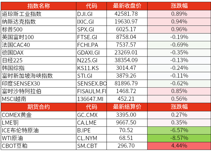 6月23日星期一,美国三大股票指数全线上涨,道琼斯工业指数涨0.89%报42581.78点,标普500指数涨0.96%报6025.17点,纳斯达克指数涨0.94%报19630.97点。万得美国科技七巨头指数涨1%。欧洲三大股指小幅下跌、亚太主要股指普降。COMEX黄金期货价格涨0.27%,结算报价3395.00美元。国际油价全线下跌。