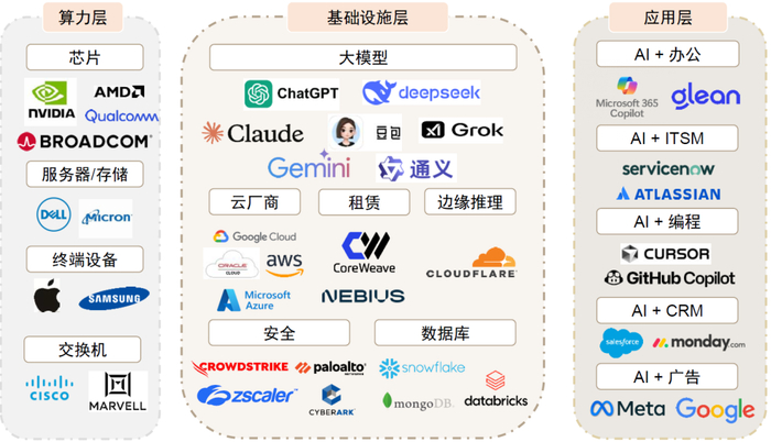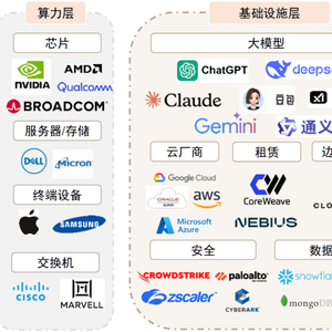 基于此前的讨论,我们认为,AI在企业端大规模商用之前,基础设施层仍需精细打磨,因此当前阶段Infra层业绩兑现度更高。此外,较多企业客户为适配自身业务,会DIY细分场景的模型、Agent及应用,因此对模型服务、数据库、云计算、安全相关需求大幅提升。我们看好云迁移、数据治理、网络安全、AI+编程相关机遇。