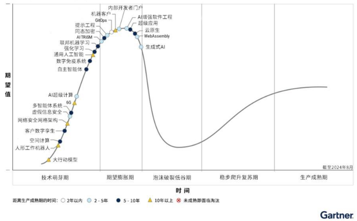 AI的发展是漫长的进程,与其他技术发展轨迹类似,都会经历技术萌芽、期望膨胀、泡沫破裂低谷、稳步爬升复苏、生产成熟期几个阶段。根据Gartner 2024年8月发布的新兴技术成熟度曲线,生成式AI正处于期望膨胀期与泡沫破裂低谷期临界点,因此目前市场上对于AI有多空两种声音。我们认为,AI在经历技术迭代、供应链趋稳、数据治理完成、模型部署与业务匹配等几个阶段后,能够进入生产成熟与大规模商用阶段。