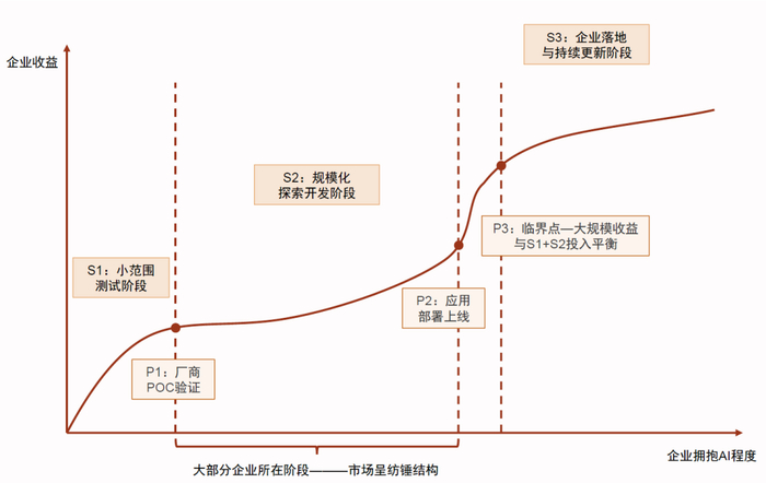 当前AI应用渗透率较市场预期仍有差距。根据IDC大模型收益曲线,当前大部分企业对AI的部署进程处于规模化探索开发阶段,企业收益较低。但随着AI应用渗透率提升,收益会呈现快速增长。进入落地与更新阶段后,收益释放明显,达到盈亏平衡点。
