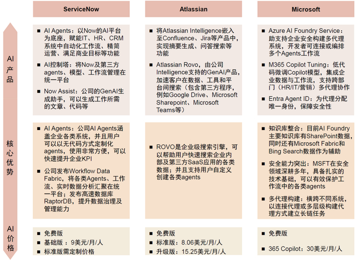 根据我们对ServiceNow、Atlassian、Microsoft三家厂商AI+工作流产品梳理,可以发现供应商多聚焦于:1)助力客户以低代码或无代码方式构建定制化AI Agents;2)数据及知识库整合,融合企业内部数据、第三方数据、AI agents等至统一平台,提升企业工作流AI能力。